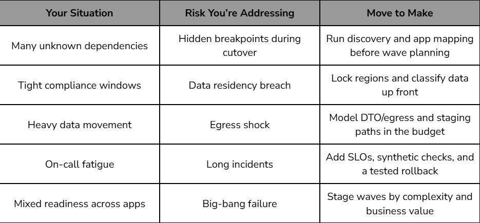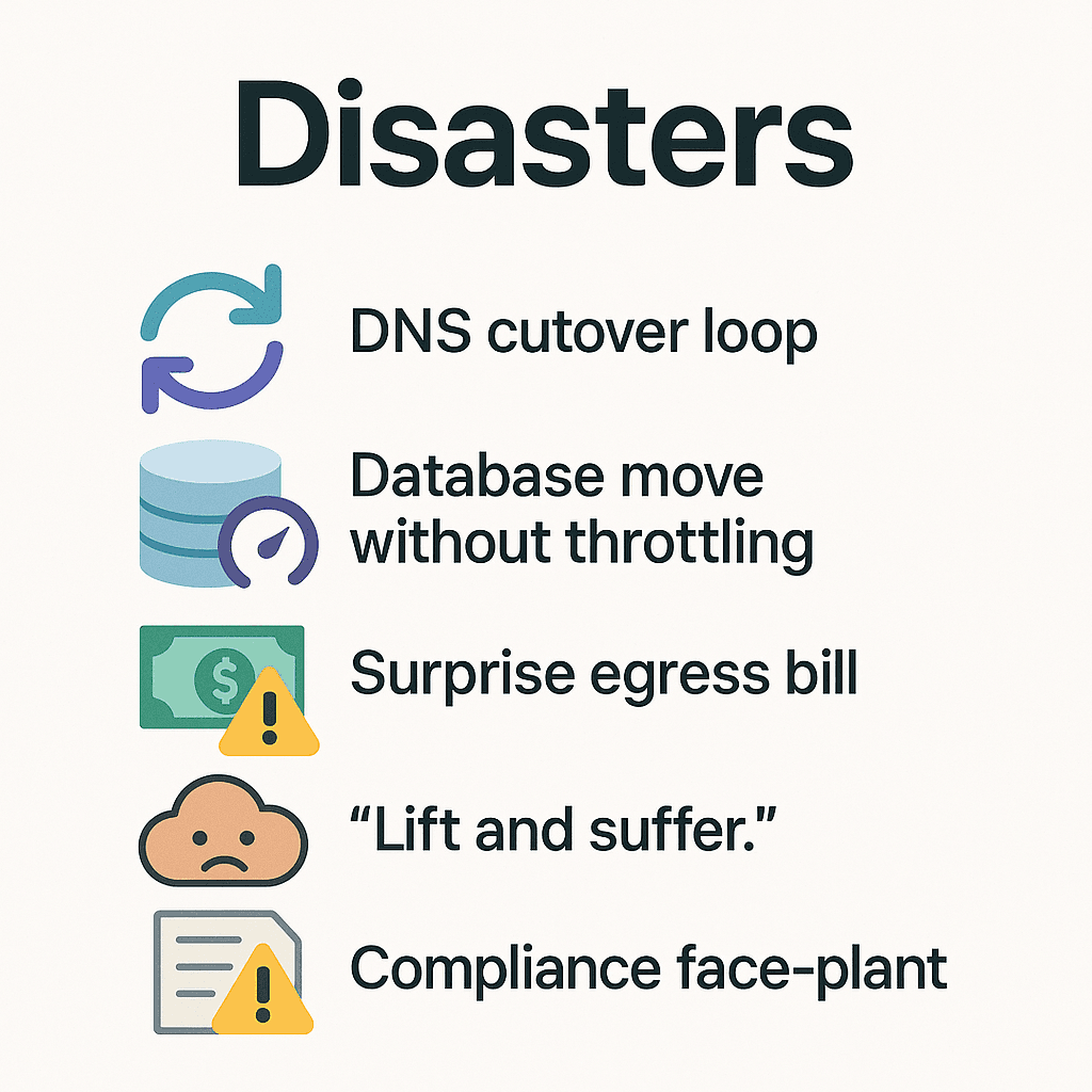 Cloud wins show up only when you plan for failure first. Model costs, run small waves, keep a rollback, and treat risk as work you schedule. Use a formal cloud migration risk assessment, not guesses. AWS and Google Cloud data back this up: most serious outages are preventable, and structured migration frameworks reduce exposure.